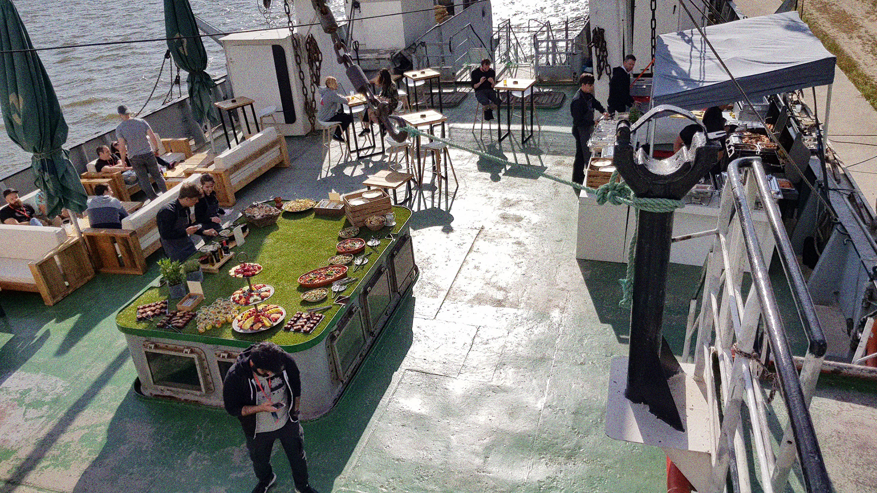 200 m², view of Elbe bridges and the harbor, 300 people, large bar, small balcony at the stern, optional sun canopy.